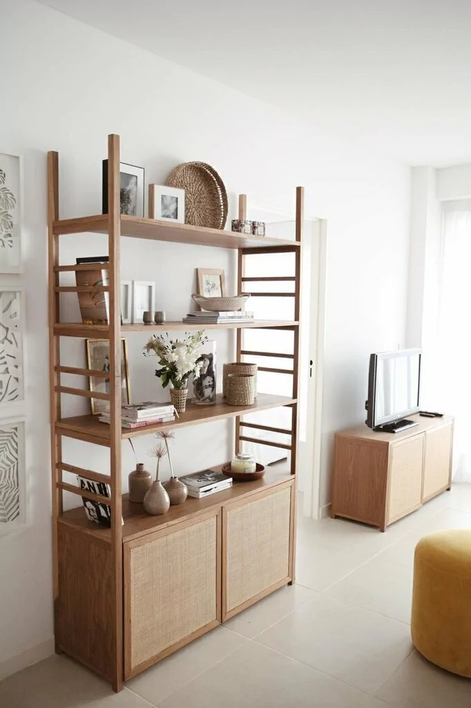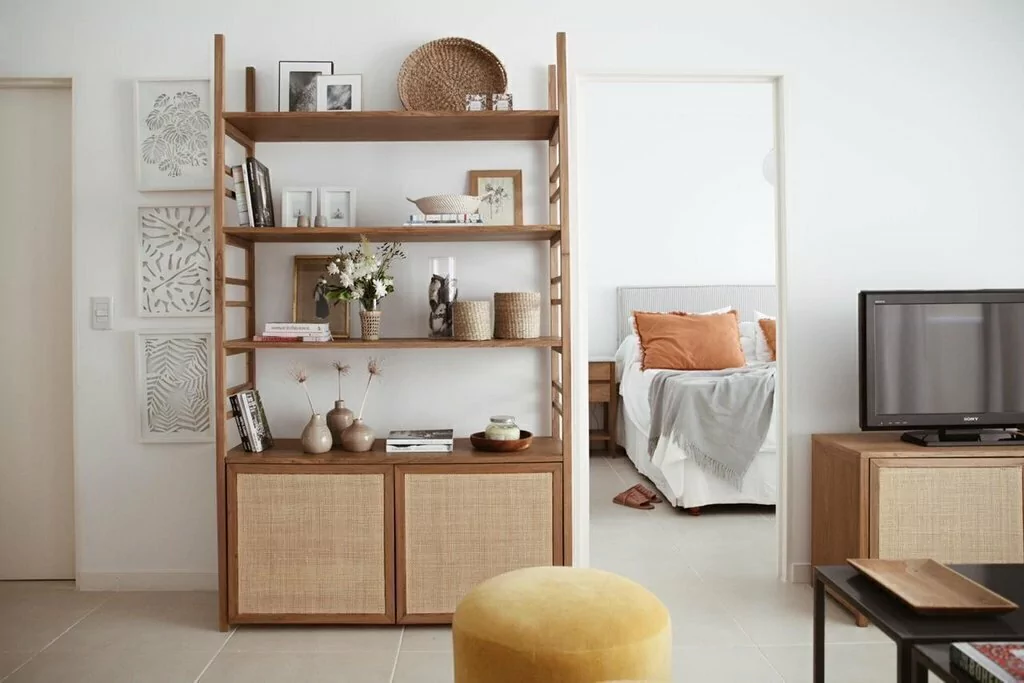 Con estructura enchapada en petiribí y puertas con esterilla natural y estante interno. Terminación con laca poliuretánica transparente semi mate.