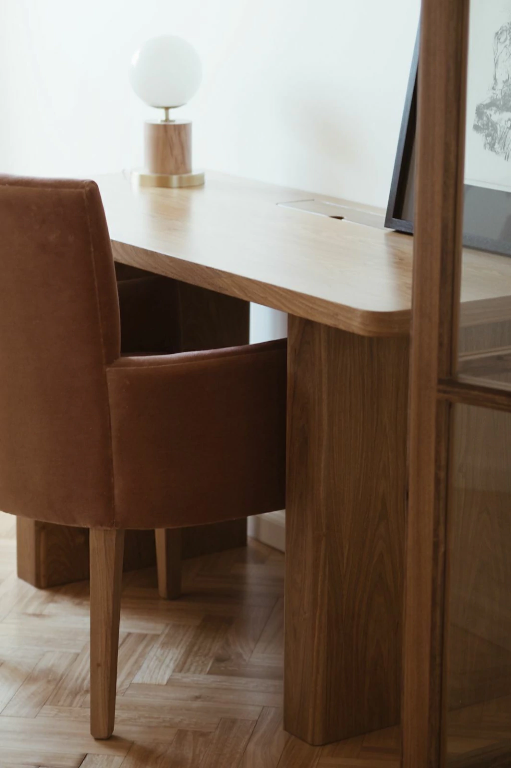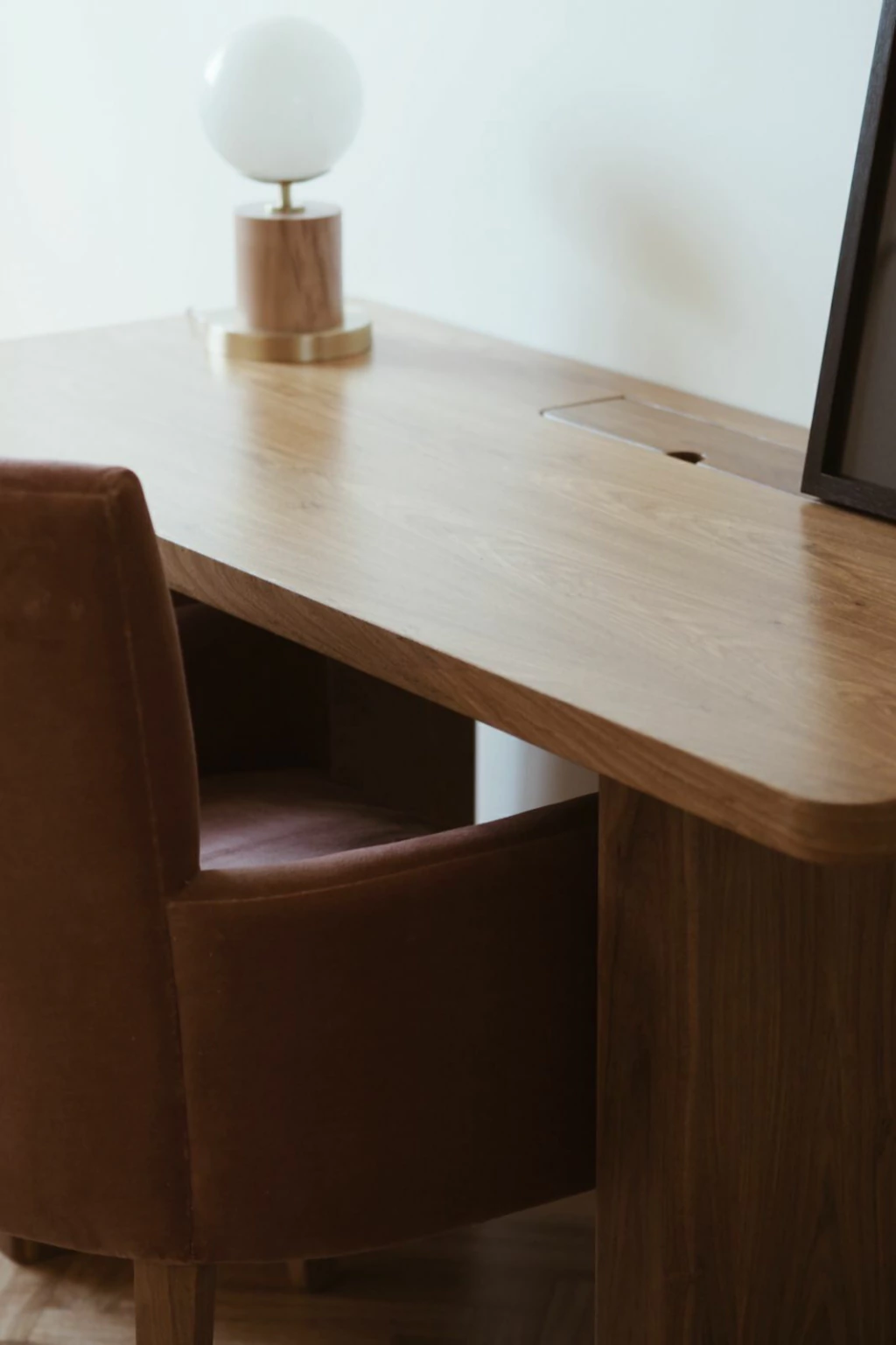Escritorio enchapado en petiribi con bolsillo para enchufes.