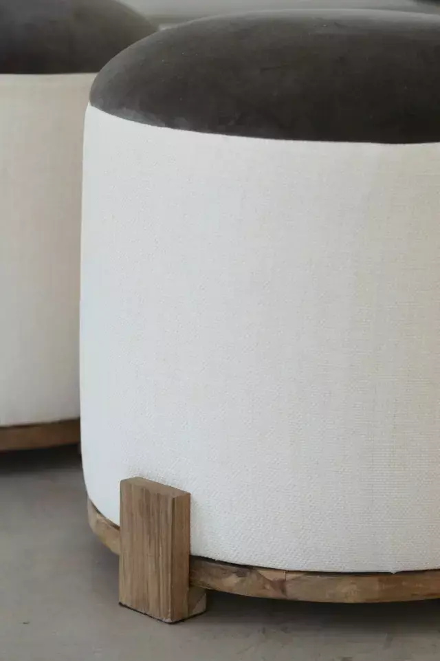 Puff tapizado en rafia y terciopelo con detalle de vivo. Base en madera de petiribí.