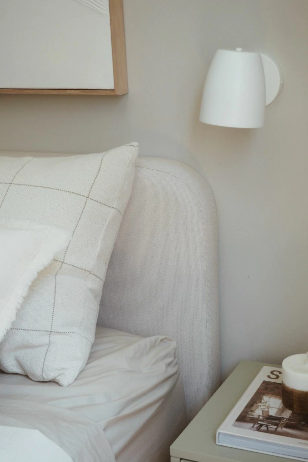 Estructura de madera con goma espuma con puntas redondeadas. Tapizado en grilla blanco caliza.