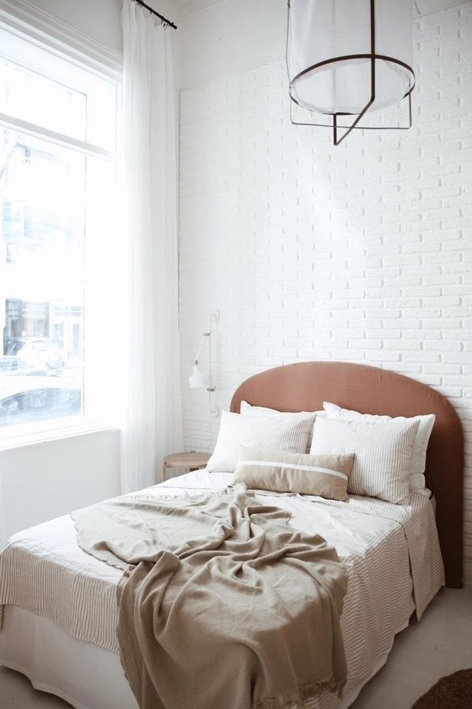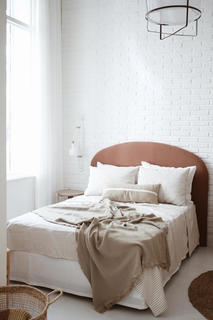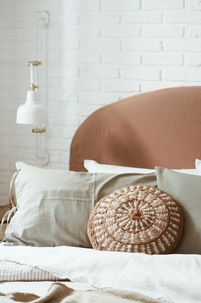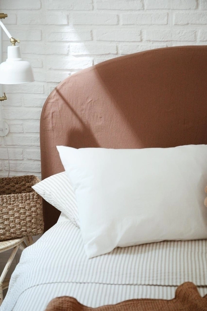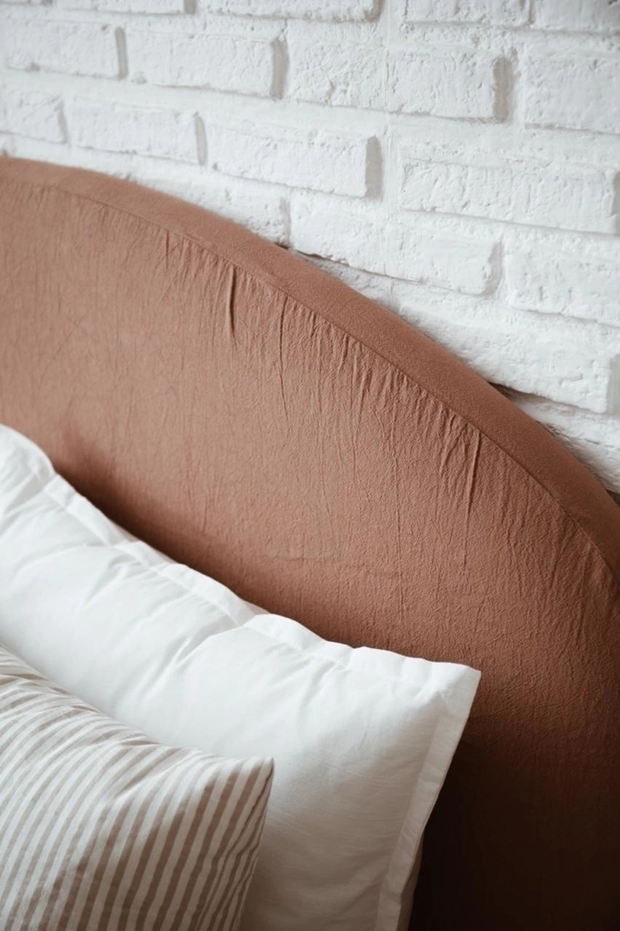 Estructura de madera con goma espuma con forma curva. Tapizado en algodón natural + funda de algodón en color a elección. Funda lavable con terminación simple, con cierre atrás.