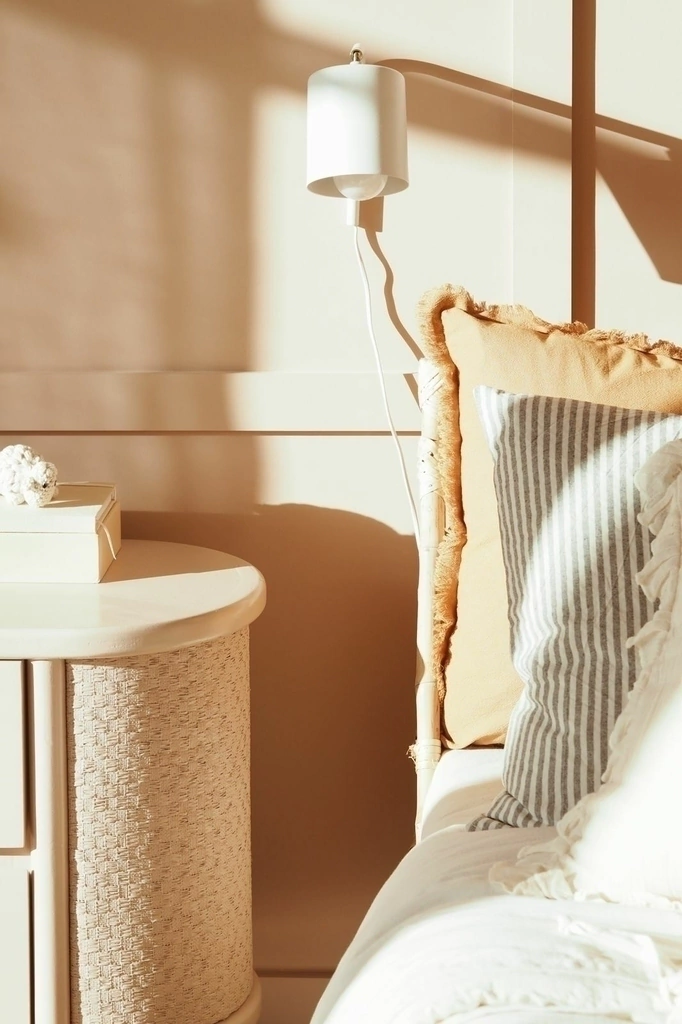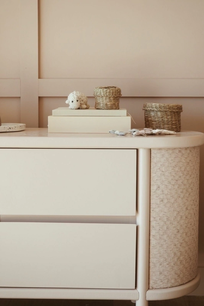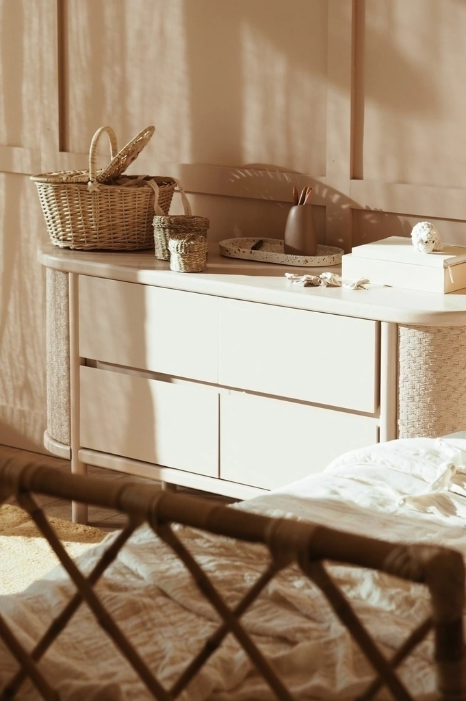 En MDF laqueada en color a elección con laterales redondeados de rafia. 4 cajones con apertura mediante buña.