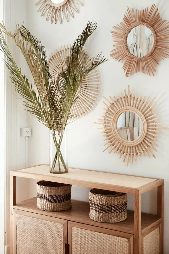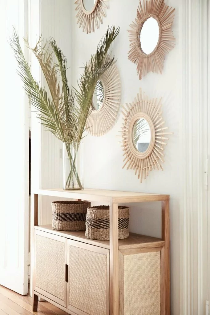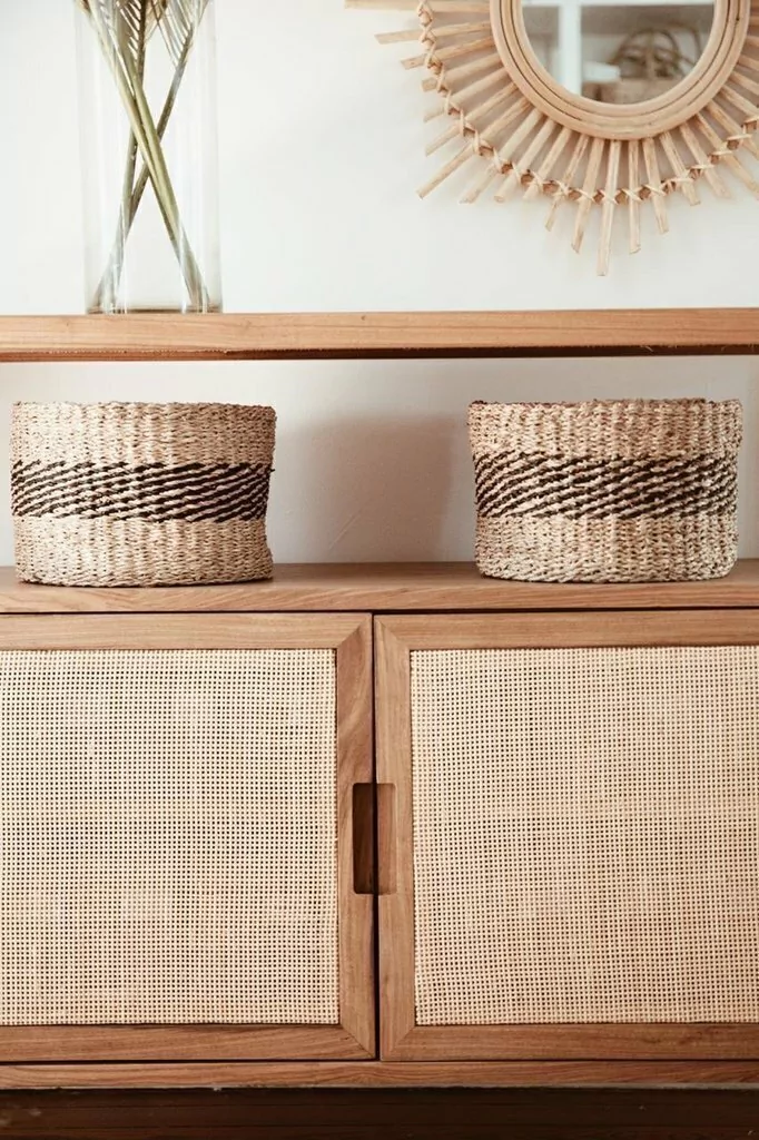 En estructura de petiribí macizo, con estantes enchapados + puertas, lateral y tapa con esterilla americana. Agarre calado en puertas. Terminación con laca poliuretánica semi mate transparente.