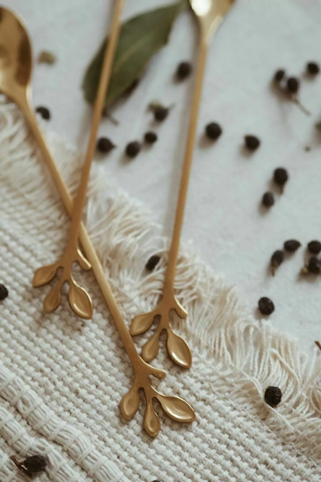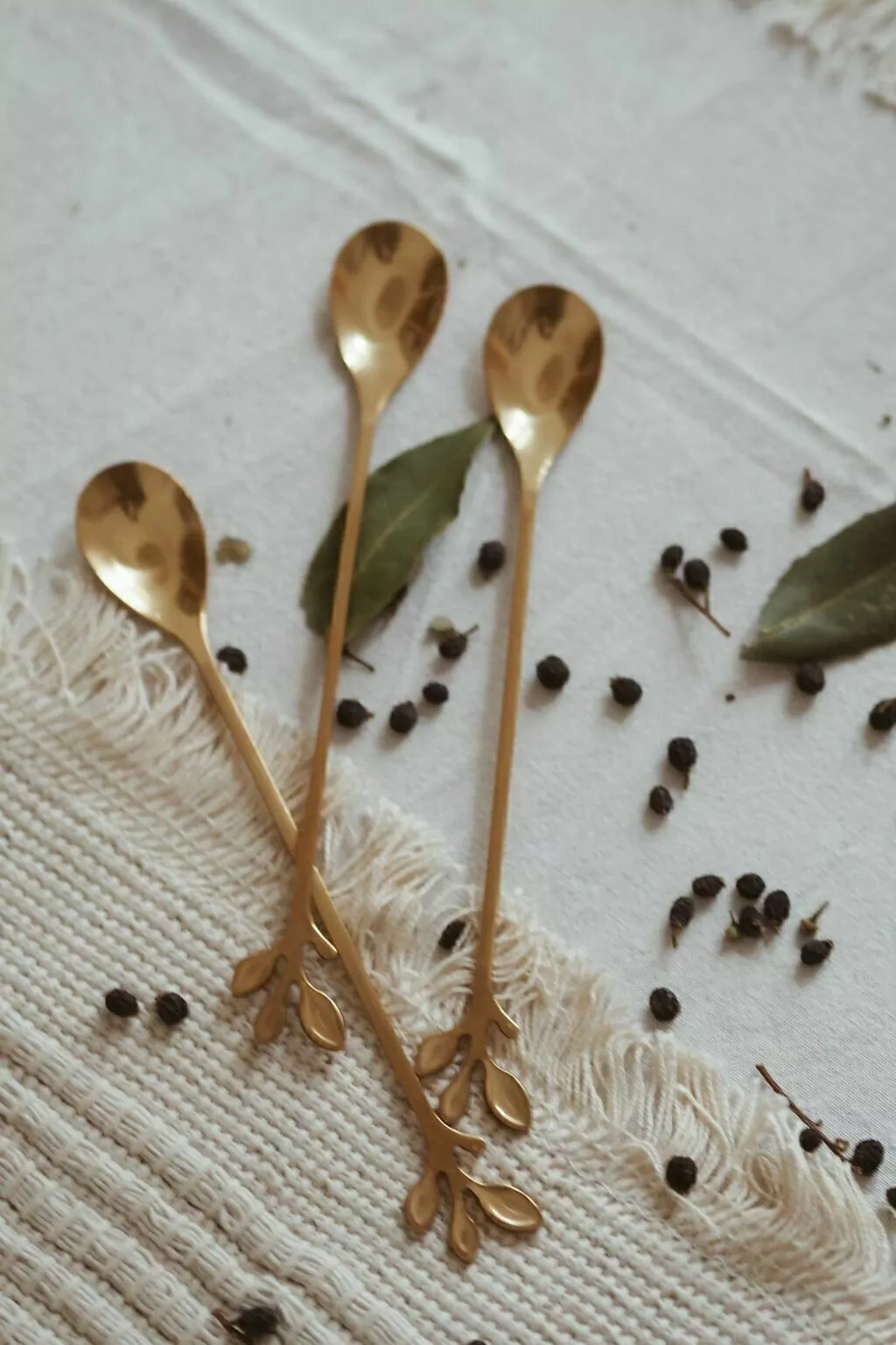 Cuchara larga con baño dorado con terminación tipo hojas.