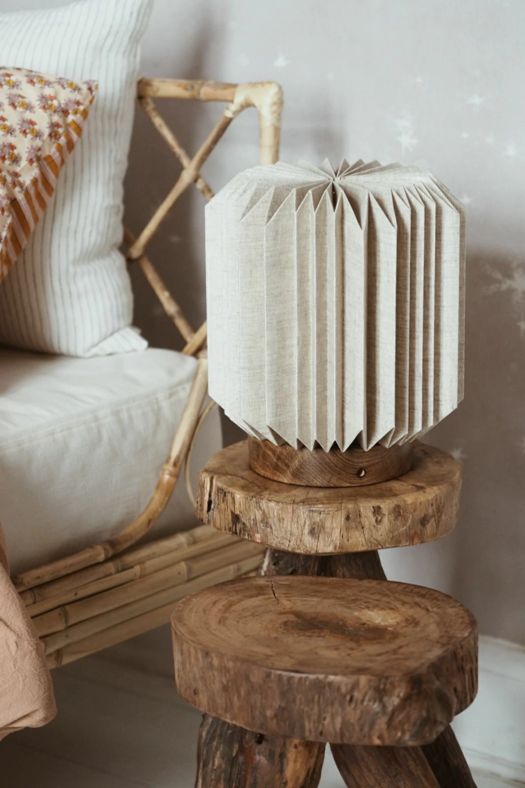 Lámpara de mesa realizada artesanalmente en lino europeo natural sobre papel.