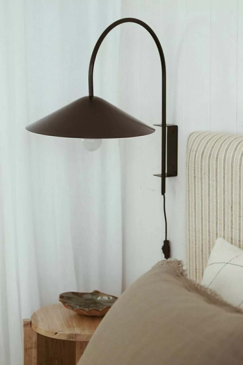 Lámpara de pared con pantalla cónica realizada en hierro repujado. Disponible en color blanco, negro, nude y visón.